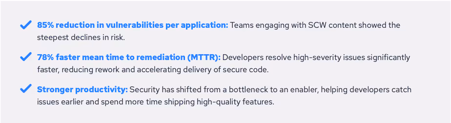 Con el apoyo de los altos cargos y objetivos cuantificables en torno a la reducción de riesgos, Mads pudo empezar a medir el éxito no sólo en relación con el número de personas en una plataforma y las horas jugadas, sino también con el tiempo necesario para solucionar vulnerabilidades, la antigüedad de las vulnerabilidades y la comparación con las nuevas funciones creadas para los clientes, a fin de obtener un punto de vista holístico sobre la reducción de vulnerabilidades. Para un equipo, el impacto fue enorme, con una reducción del 82% en el tiempo medio para solucionar una vulnerabilidad..
